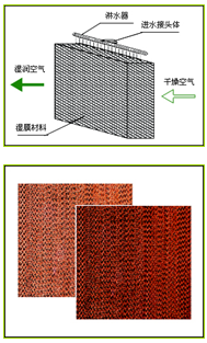 直排水濕膜加濕器的核心加濕部件是濕膜材料和淋水器,濕膜材料(又稱(chēng)“賽代克”),是以植物纖維為基材,經(jīng)過(guò)特殊成分的樹(shù)脂處理燒結形成波紋板狀交叉重疊的高分子復合材料;淋水器是讓水能夠均勻淋灑在濕膜材料頂部,水在重力作用下,沿濕膜材料向下滲透,水被濕膜材料吸收,形成均勻的水膜;當干燥的空氣通過(guò)濕膜材料時(shí),水分子充分吸收空氣中的熱量而汽化、蒸發(fā),使空氣的濕度增加,形成濕潤的空氣.這一加濕過(guò)程空氣的溫度下降,但空氣的焓值保持不變.